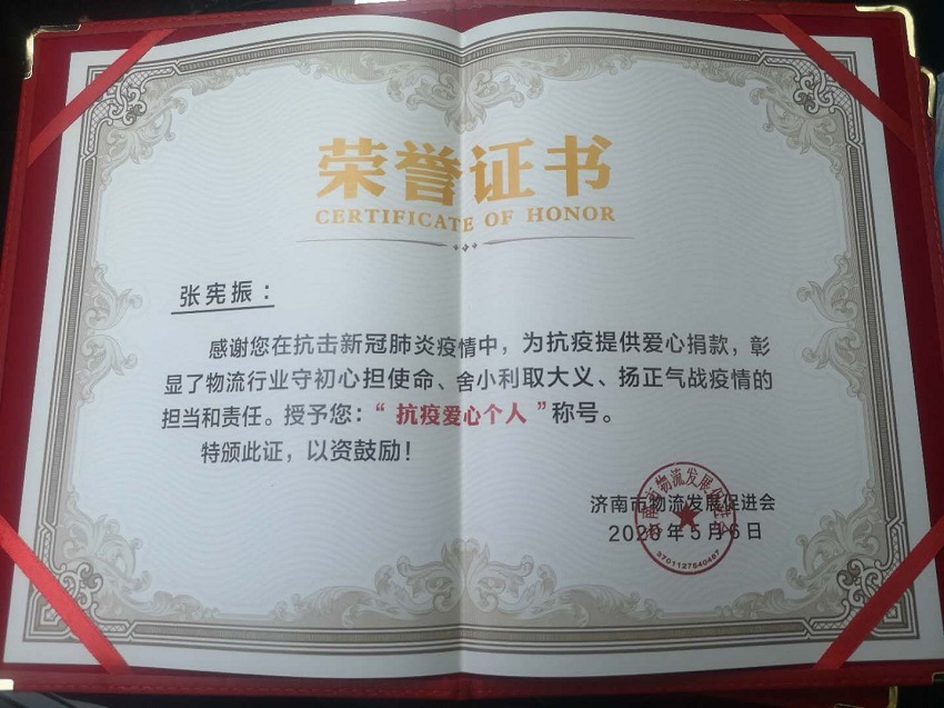 經(jīng)評(píng)選,振宇物流榮獲“抗疫先進(jìn)單位”,總經(jīng)理張憲振榮獲“抗疫愛心個(gè)人”!