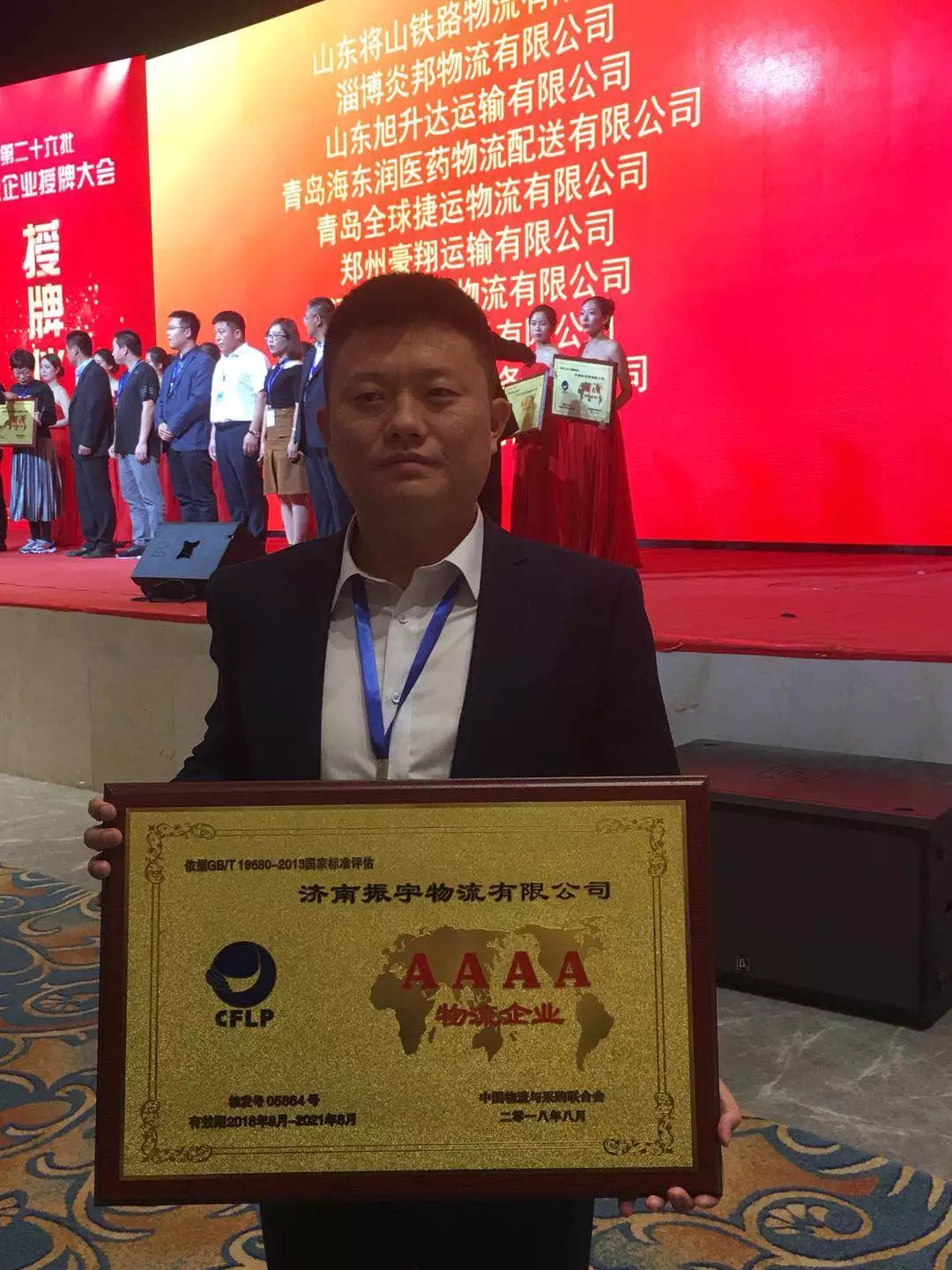2018年9月16日,由中國(guó)物流與采購(gòu)聯(lián)合會(huì)主辦的A級(jí)物流企業(yè)授牌大會(huì)暨物流業(yè)創(chuàng)新發(fā)展論壇在吉林省長(zhǎng)春市隆重舉行。會(huì)議對(duì)本批A級(jí)物流企業(yè)進(jìn)行了集中授牌,濟(jì)南振宇物流有限公司榮獲國(guó)家AAAA級(jí)物流企業(yè),總經(jīng)理張憲振代表公司出席會(huì)議并接受授牌。