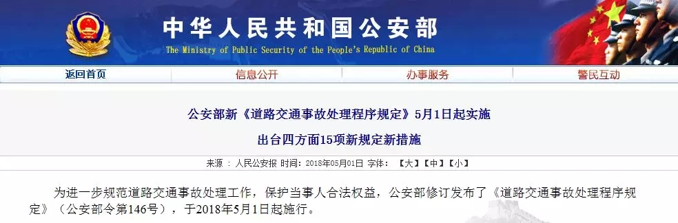 為進一步規(guī)范道路交通事故處理工作,保護當事人合法權益,日前,公安部修訂發(fā)布了《道路交通事故處理程序規(guī)定》(公安部令第146號),該規(guī)定已于2018年5月1日起正式施行。