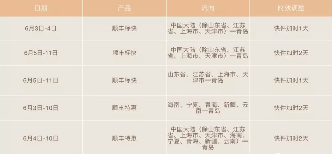 6月3日-11日,全網進出青島流向的順豐次晨、即日、生鮮速配、部分醫藥冷運等對溫度及時效要求較高的產品和冷藏冷凍件停收,物流普運等重貨類產品停收(重貨快運加時不停收)。